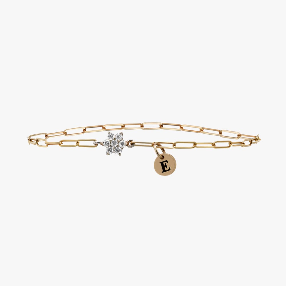 This paperclip bracelet features a charming cluster of seven round natural diamonds, elegantly set in 14K yellow gold, perfect for adding a touch of whimsy to any outfit.