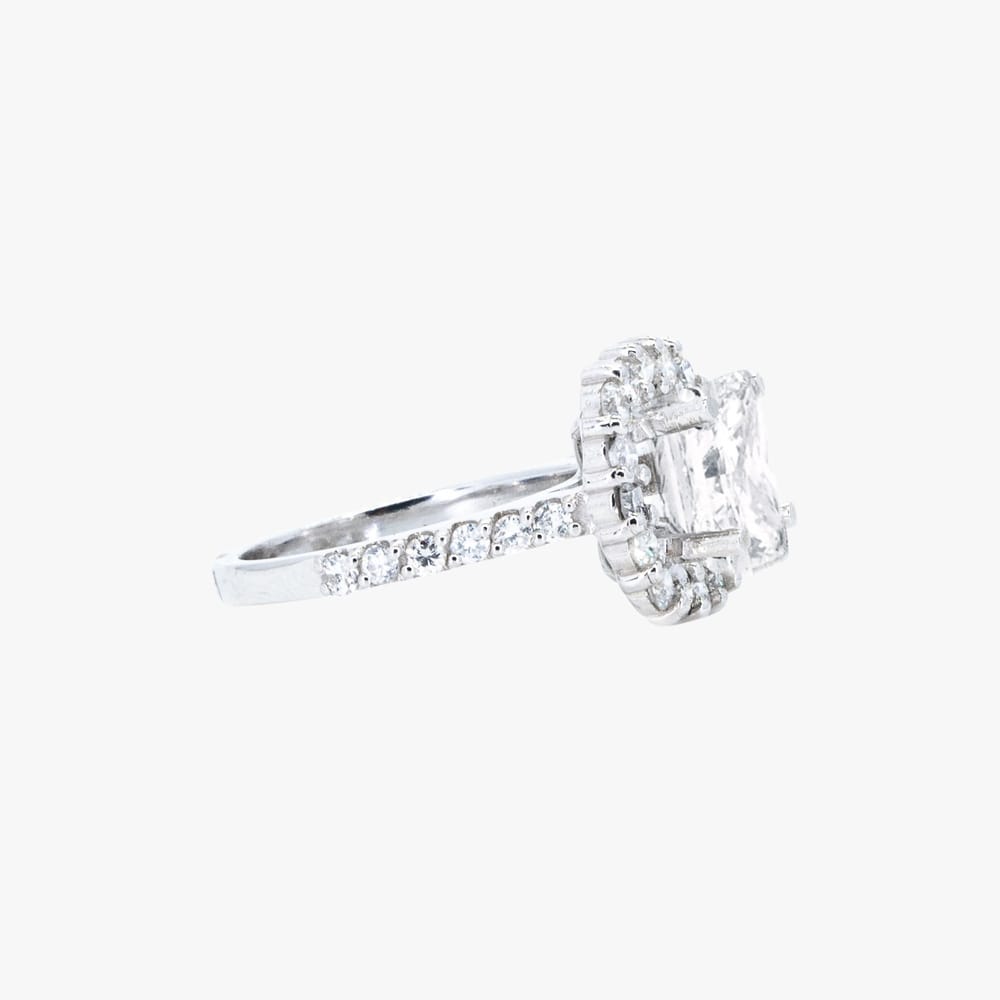 This exquisite semi-mount engagement ring features a captivating prong set cushion halo and 1.35 carats of sparkling diamonds, crafted in luxurious 14KT white gold.