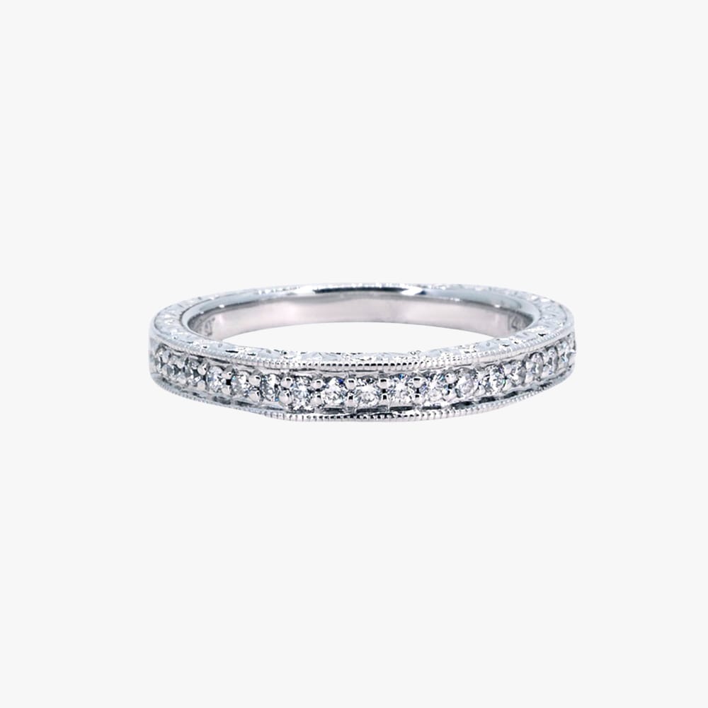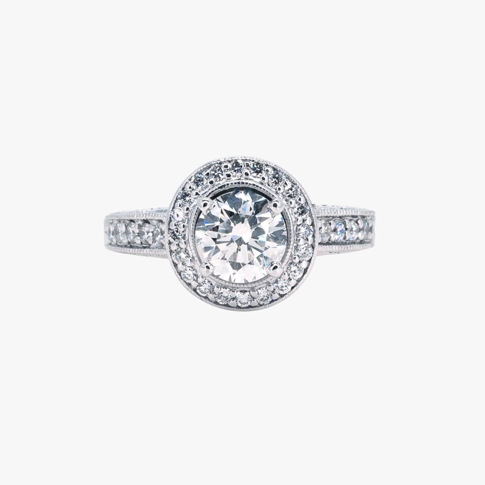 This exquisite semi-mount wedding set features milgrain detailing and a pave set halo of round cut diamonds, designed to elevate your precious stone beautifully.