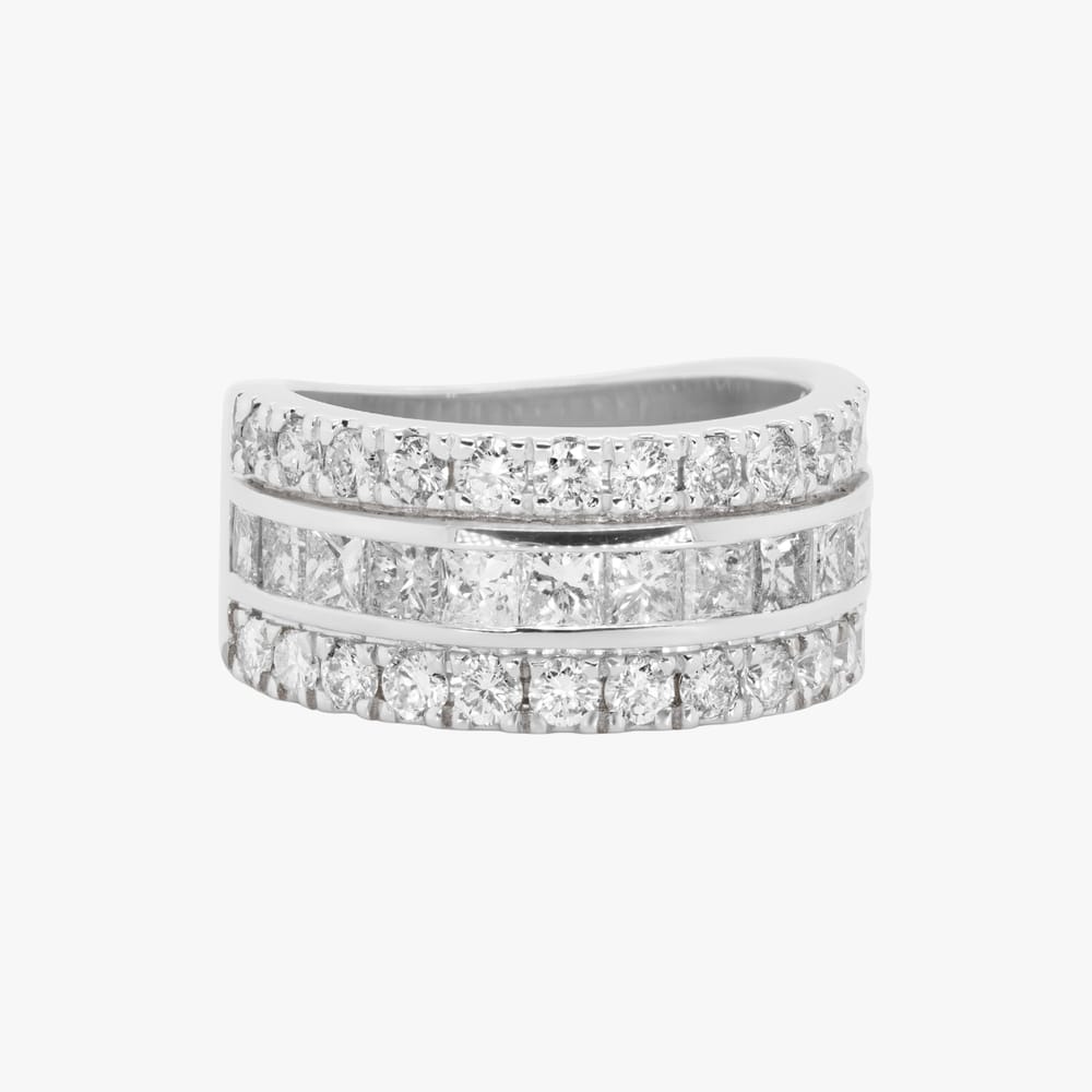 This elegant ring features a captivating combination of channel set princess and pave set round cut diamonds, showcasing a total weight of 1.76 carats in a luxurious 14K white gold setting.