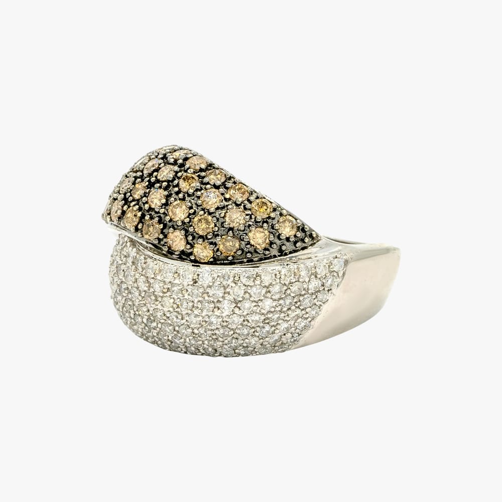 This exquisite ring features an elegant combination of white and chocolate diamonds, totaling 1.82 carats, set in premium 14K white gold for a striking look.