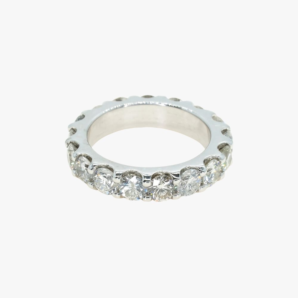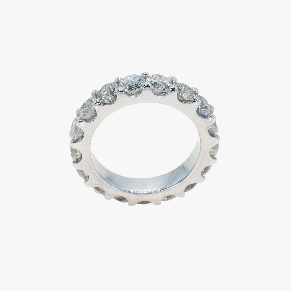 This exquisite 14k white gold women's wedding band features a breathtaking arrangement of round cut diamonds set in elegant shared prong style, designed to symbolize eternal love.