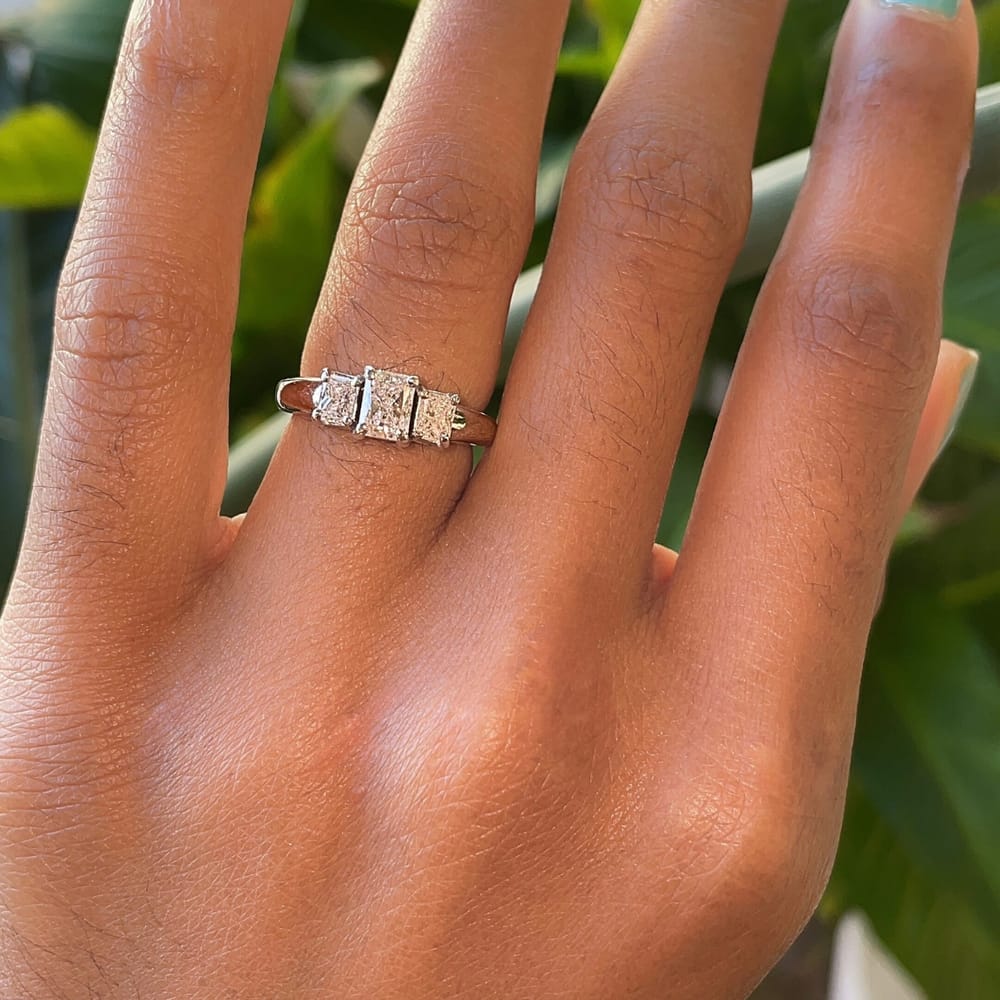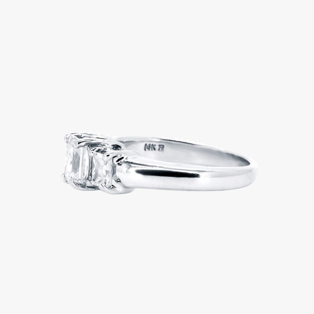 This exquisite engagement ring features a breathtaking radiant cut design with three sparkling diamonds set in elegant 14K white gold, perfect for commemorating a special love.