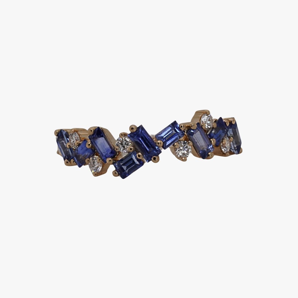 Crafted in luminous 14K yellow gold, this modern band features a playful arrangement of blue sapphire baguettes interspersed with round brilliant diamonds. The scattered, asymmetrical design gives the ring a fresh, contemporary feel while showcasing the striking contrast between the ocean-blue sapphires and the sparkling white diamonds.