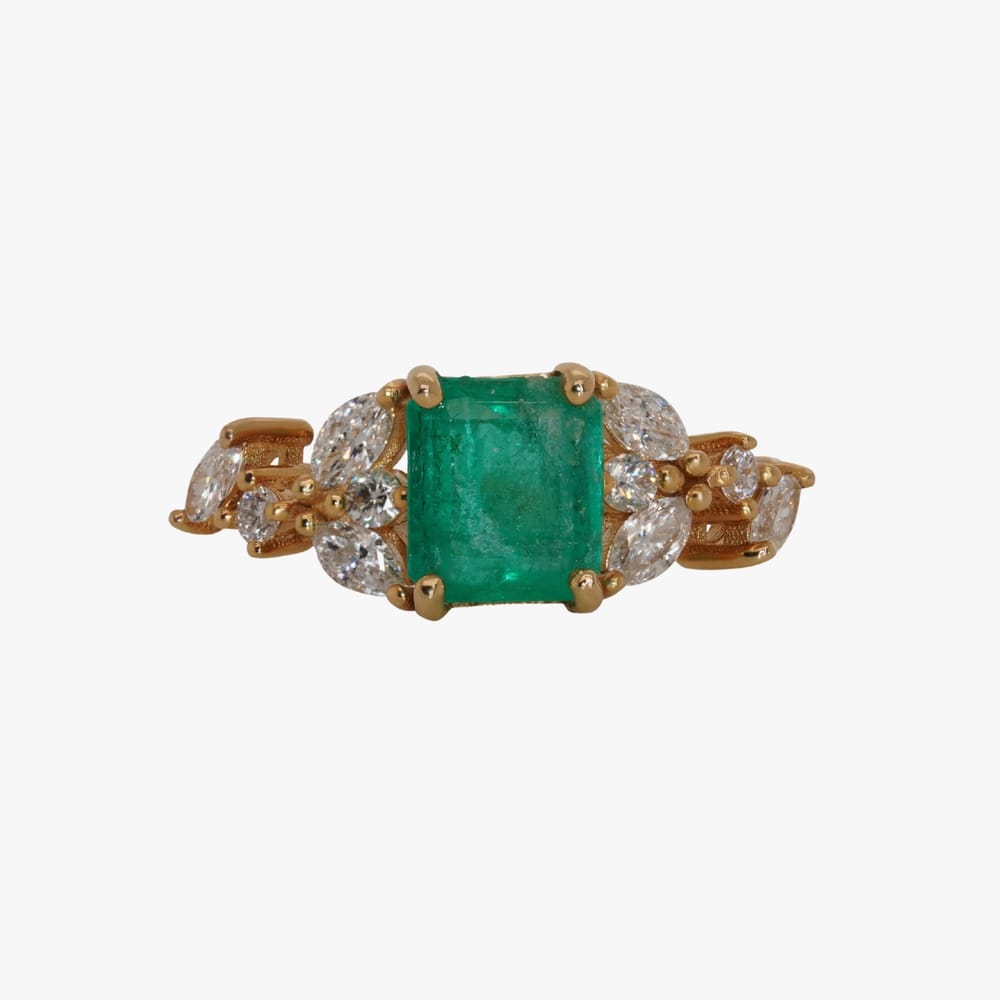 This exquisite ring features a vibrant green square emerald at its center, complemented by a dazzling array of marquise and round diamonds, beautifully crafted in 14K gold.