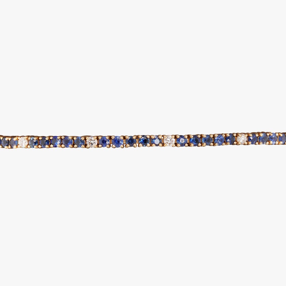 This elegant tennis bracelet features a captivating arrangement of blue sapphires and sparkling diamonds set in lustrous 14K yellow gold, perfect for adding a touch of sophistication to any outfit.