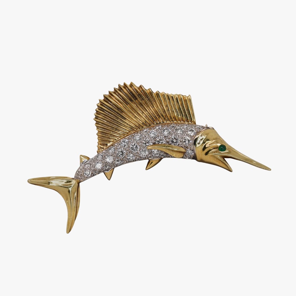 This exquisite unisex brooch features a beautifully designed swordfish crafted from 18K yellow gold, adorned with 2.50 carats of dazzling round diamonds with SI1-SI2 clarity, making it a perfect accessory for any attire.