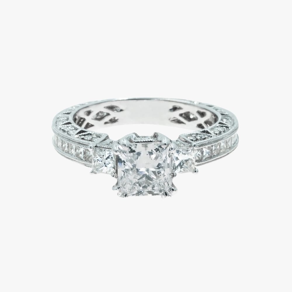 This elegantly designed semi-mount engagement ring features a dazzling 1.44CTW of princess cut diamonds set in luxurious 18KT white gold, perfect for celebrating your love.