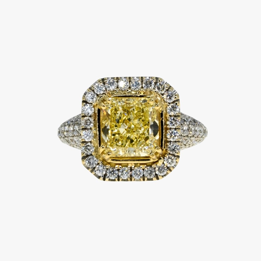This exquisite engagement ring features a radiant 2.50 carat center fancy yellow diamond, beautifully set in luxurious 18KT white gold with 1.50ctw halo of brilliant round cut diamonds, creating a stunning contrast and timeless elegance.