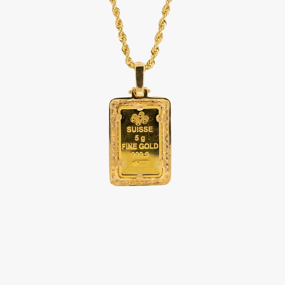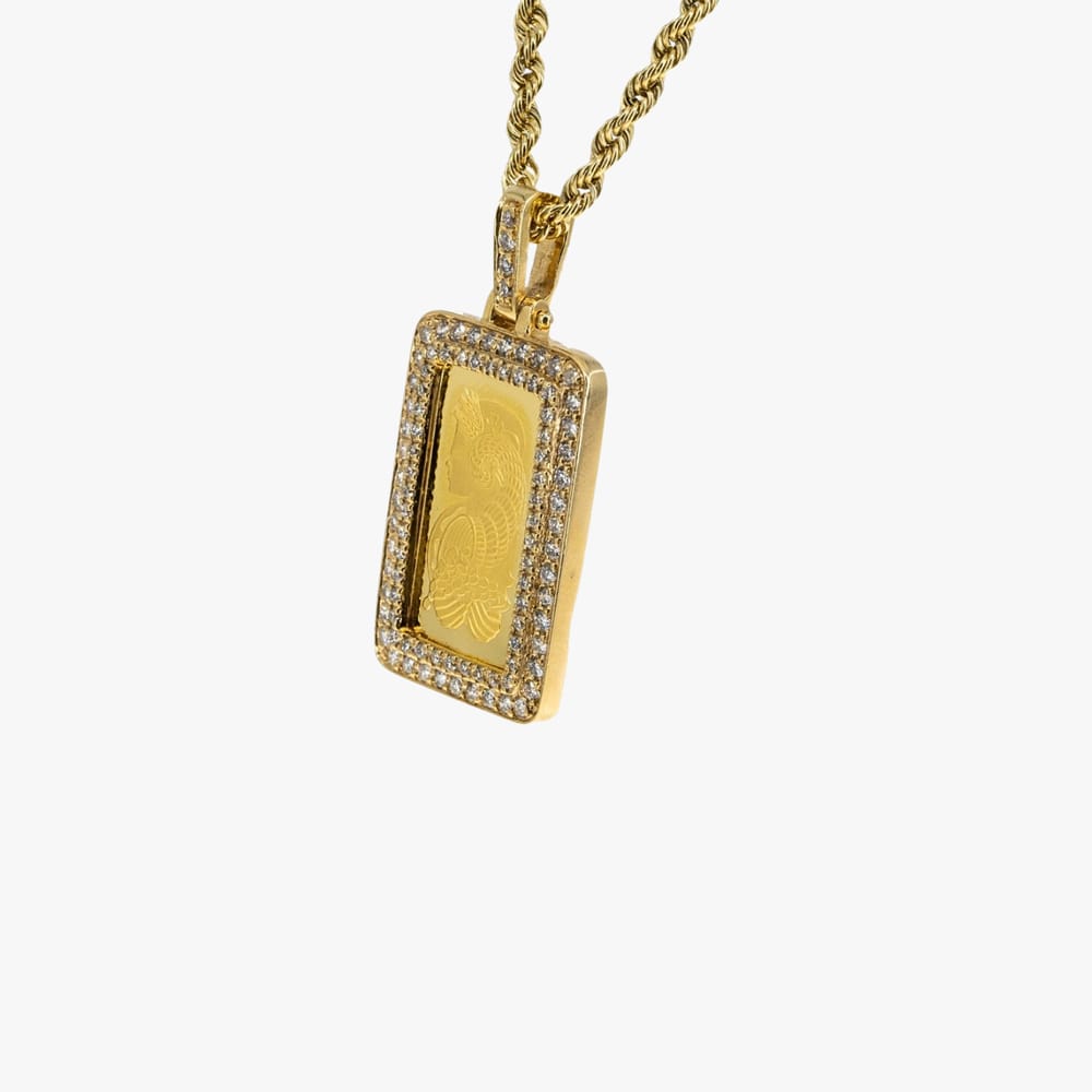 This exquisite jewelry set features a 6.50g 10KT yellow gold chain adorned with a 5.00g 24KT Pamp Suisse Lady Fortuna pendant, complemented by 109 brilliant round cut diamonds totaling 1.15CTW with SI clarity and F-G color, all showcasing a polished finish that enhances its elegance.