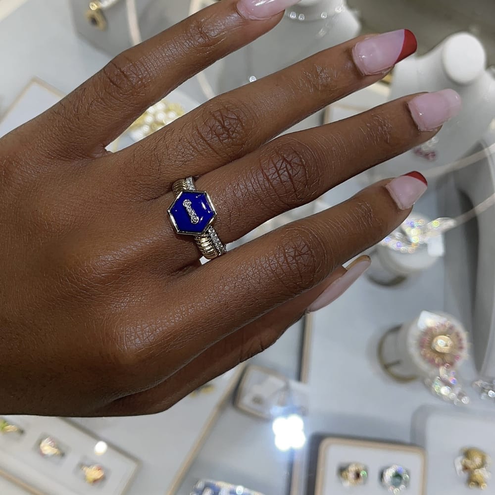 This exquisite ring features a striking blue lapis lazuli center stone in a unique pentagon shape, complemented by sparkling round diamonds, set in rich 14K gold for an elegant touch.