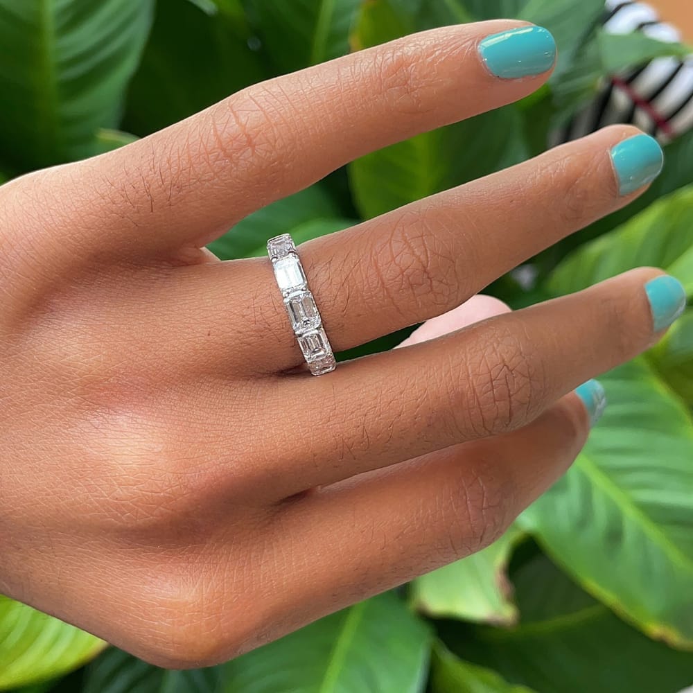This exquisite channel set wedding band features 3.00 carats of emerald cut diamonds, crafted from premium platinum, perfectly tailored for every day wear.