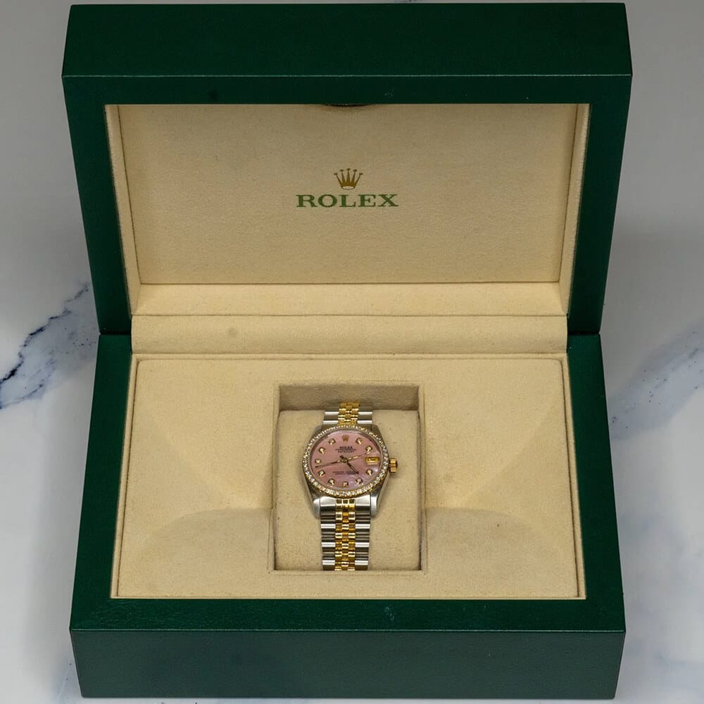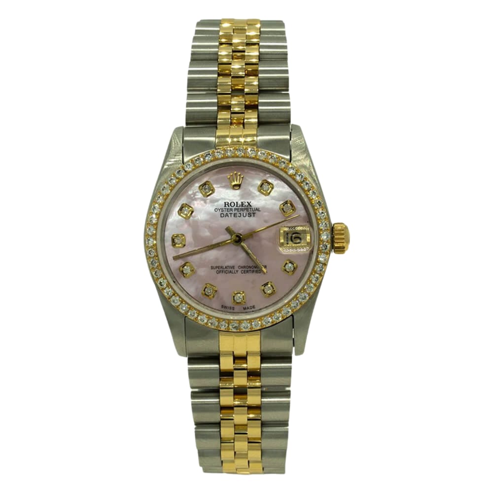 This certified pre-owned Rolex Datejust features a MOP pink dial and 2.00ctw diamond bezel.