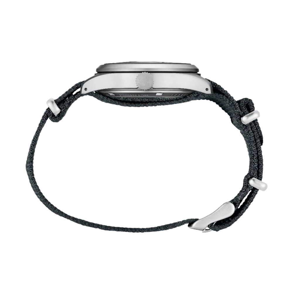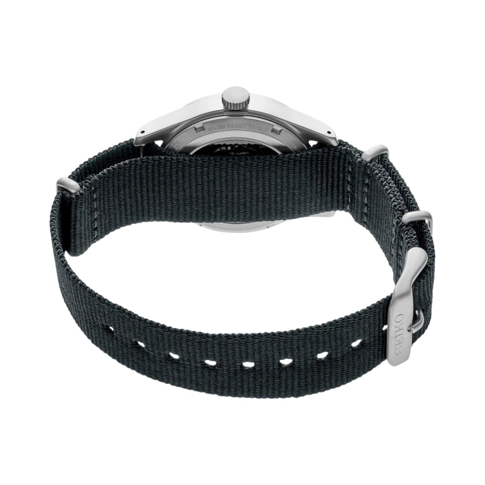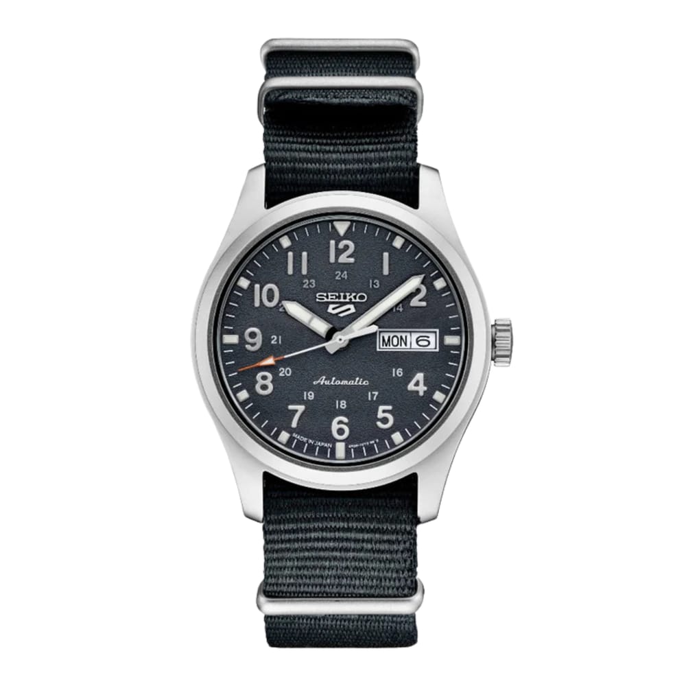 Seiko 5 Sports. Inspired by classic field/military design, this stylishly retro watch offers authentic lines with both durability and all-day excellence. Providing automatic technology that you control with every movement, this versatile watch is powered by a 24-jewel movement that beats at a frequency of 21,600 vibrations per hour, with a power reserve of approximately 41 hours and manual winding capability. The blue-gray dial features Arabic numerals, a day/date calendar, red-orange tipped second hand, and luminous hands and markers. Crafted of stainless steel with blue-gray nylon strap and a screwdown see-through caseback for a view of classic timekeeping in action. 10 bar, 100M Water Resistant