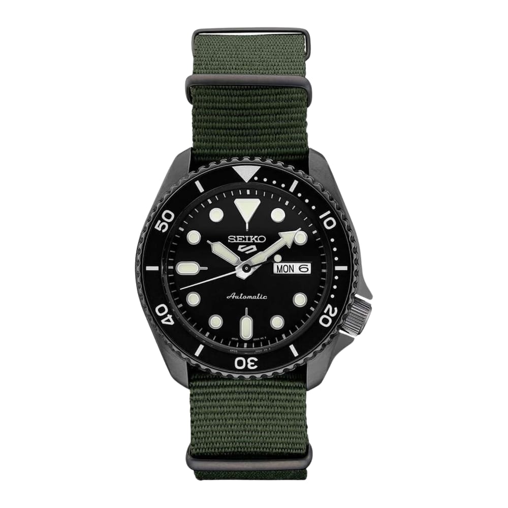 Show your style. Make your move. For over 50 years, Seiko 5 Sports has delivered consistently high levels of reliability, durability, and performance. For dependable timekeeping in your everyday life, this exceptional watch is powered by an automatic movement with a power reserve of approximately 41 hours and features a day/date calendar, LumiBrite hands and markers, and a see-through caseback. With a black ion finished stainless steel case and dark green nylon strap and a black dial framed by a black rotating bezel, this versatile watch is 100 meter water resistant- perfect for your style no matter what your day has in store.