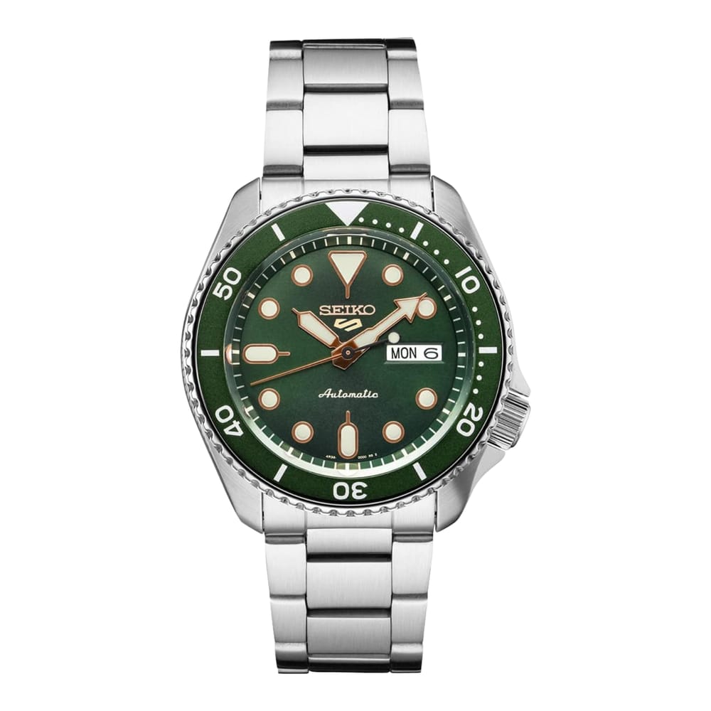 Show your style. Make your move. For over 50 years, Seiko 5 Sports has delivered consistently high levels of reliability, durability, and performance. For dependable timekeeping in your everyday life, this exceptional watch is powered by an automatic movement with a power reserve of approximately 41 hours and features a day/date calendar, LumiBrite hands and markers, and a see-through caseback. With a durable stainless steel case and bracelet and a green dial with rose gold accents framed by a green rotating bezel, this versatile watch is 100 meter water resistant- perfect for your style no matter what your day has in store.