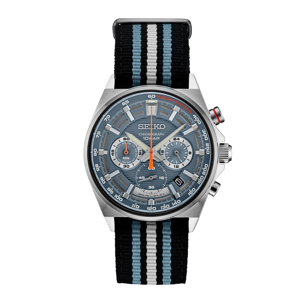 Here we have a Seiko chronograph that was envisioned to be used for car racing, and inspired by the view of an engine compartment. The blue dial is multi-layer, with embossing and metallic applied elements. These features add depth to the dial. Go ahead, zoom in and check out the details.