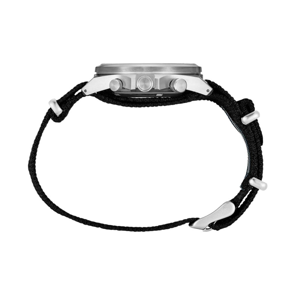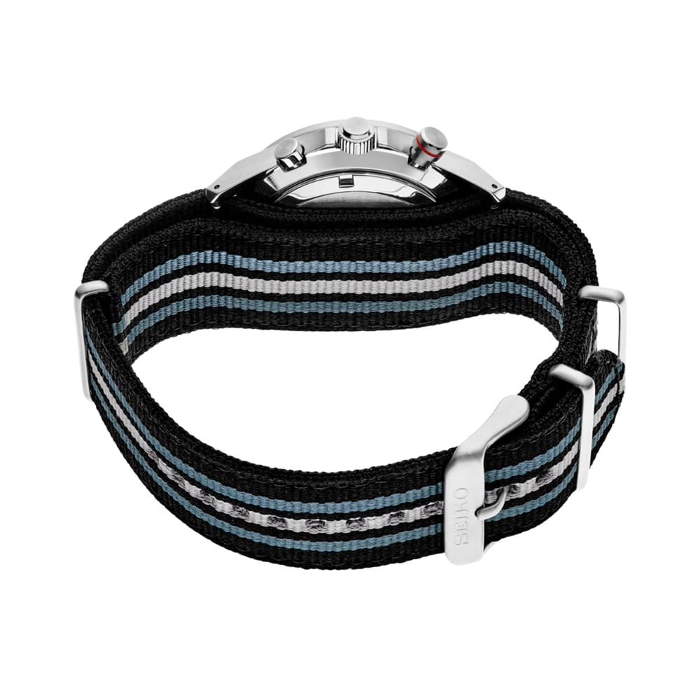 The hands and the 12 hour marker are filled with white luminous material for reading the time in the dark. The 41mm diameter brushed stainless steel case is 12.5mm thick and 48mm tip to tip. With the bracelet the weight is 85 grams. The nylon strap uses grey and blue lines to perfectly match the dial. The movement is a Seiko Caliber 8T63 that is powered by a battery. Water resistance is 10 BAR or 100 meters.