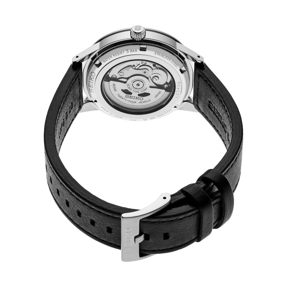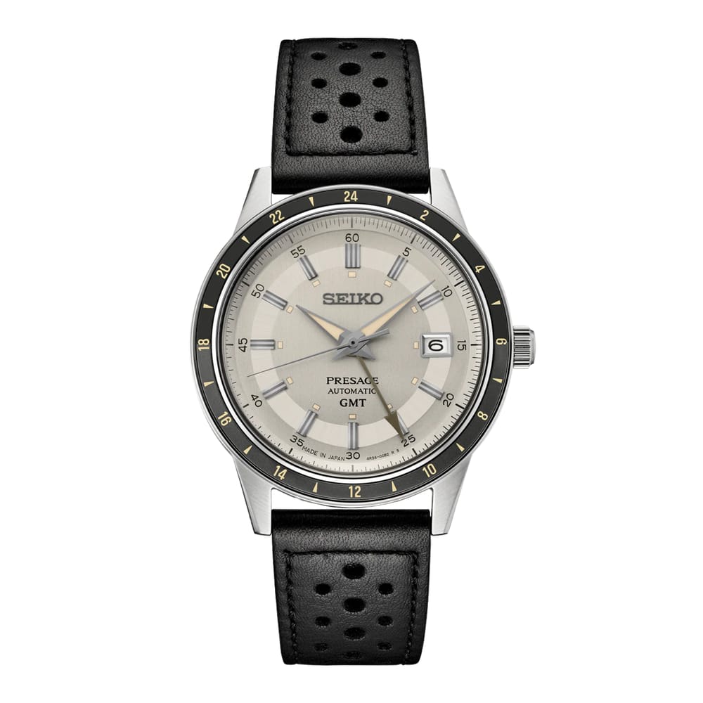 Presage Style60's GMT. Offering the finest in Japanese mechanical watchmaking, the Presage Collection blends precision technology with superior craftsmanship and design. Inspired by the steering wheel, levers, instruments and metallic colors of vintage 1960s touring cars, the Style60's GMT models create a distinctive retro feel with broad angular lines, box-shaped crystals, faceted indices and sharp hand design. Celebrating the spirit of the decade, the collection incorporates dial elements from Seiko’s 1964 “Crown Chronograph,” Japan’s first watch with a stopwatch function. Framed by a brown 24-hour GMT bezel, the sandy gray dial, a date calendar, a GMT hand, and LumiBrite hands and markers. The screwdown see-through caseback provides a view of the 24-jewel movement with manual winding capability, a frequency of 21,600 vibrations per hour and a power reserve of approximately 41 hours. Crafted of stainless steel, in a new hairline finish suggesting the metallic, machine-like feel of ’60s cars, this memorable timepiece includes a black perforated leather strap echoing classic interior elements. 5 bar, 50M Water Resistant.