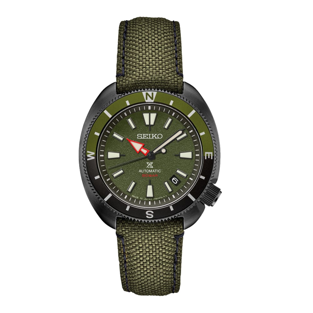 Designed for those who treat life as the ultimate adventure, Seiko Prospex keeps moving forward, meeting every challenge with technological excellence and winning design. Recalling the styles and earth-tone shades of the 1970s, as well as the colors of camping gear, this expanded collection is designed specifically for outdoor activities such as hiking, including a green and black compass bezel and a listing of emergency codes on each screwdown caseback. Providing reliable timing for every adventure, the 23-jewel automatic movement beats at a frequency of 21,600 vibrations per hour, with a power reserve of approximately 41 hours, and offers manual winding capability.