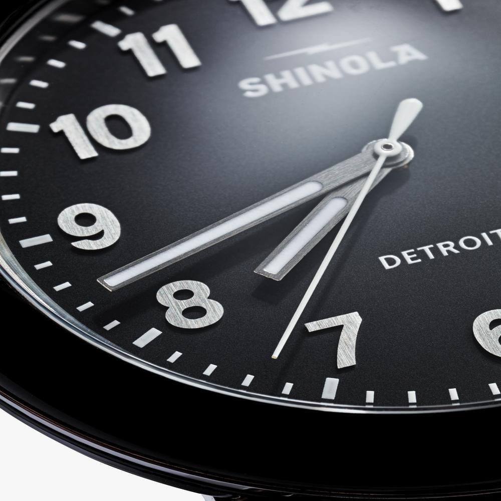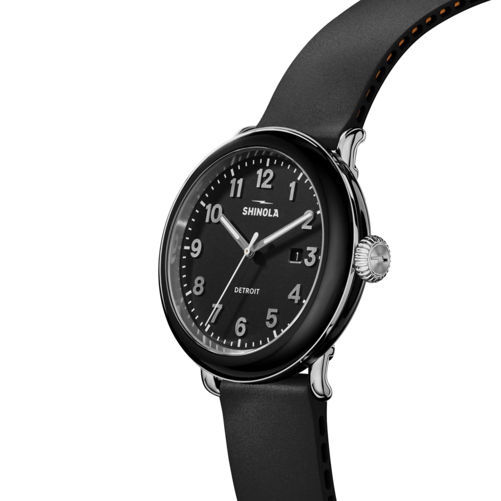 At 41mm, this piece pops on any and every wrist. Silver hands and numbers stand out against the classic black dial. A stainless steel core gives the watch its strength, and it’s co-molded with polished black TR90 resin for durability and moisture-resistance. The piece is brought together with an ultra-comfortable FKM rubber strap in black, with a classic pop of Shinola orange along the edges. Wear anywhere and everywhere—and every way but out.