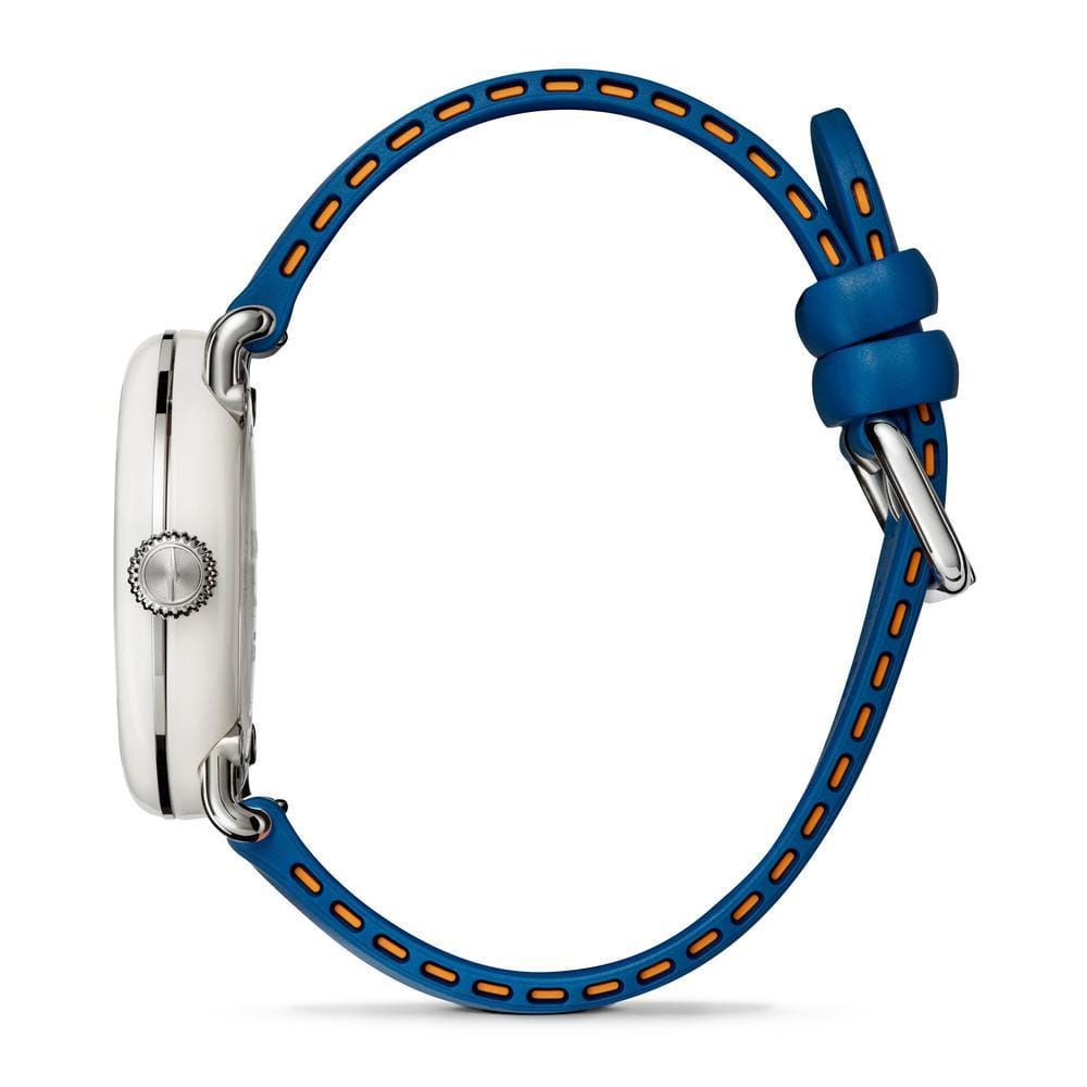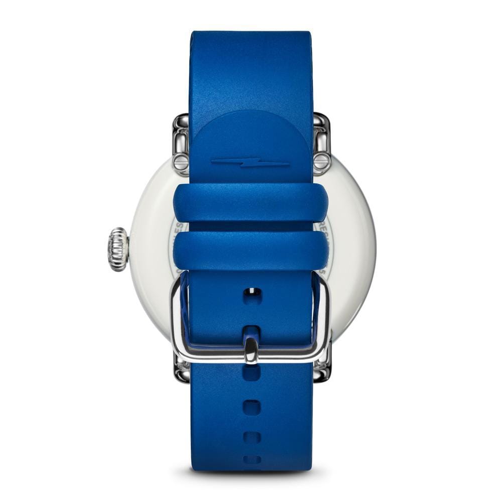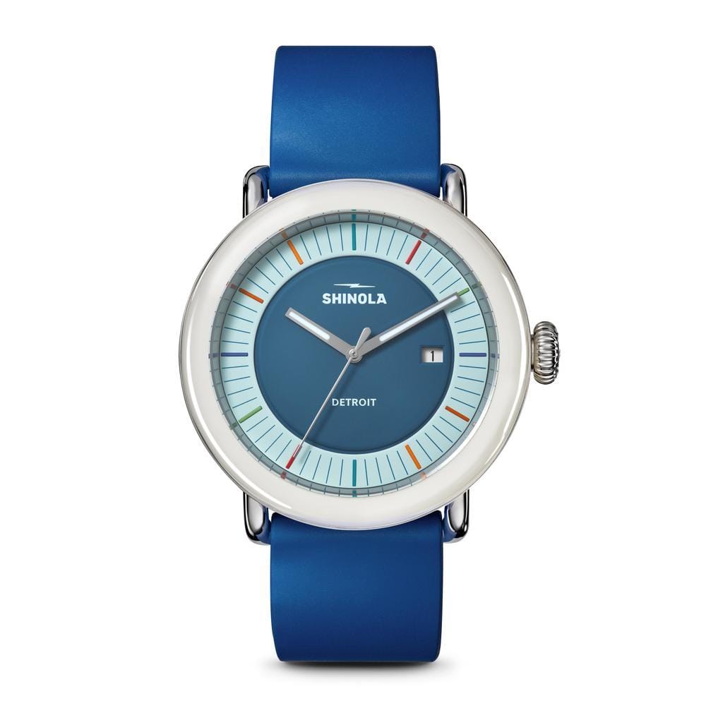 Building on the design language of the iconic Runwell, the Detrola collection brings a bold new attitude to a classic silhouette. This 41mm timepiece features a stainless steel core co-molded with polished TR90 resin for lightweight strength and durability. The vibrant blue dial with multi-color indices and a date display is powered by an Argonite 705 quartz movement, ensuring precise timekeeping. It is finished with an ultra-comfortable FKM rubber strap, making it a durable and stylish accessory for everyday wear.