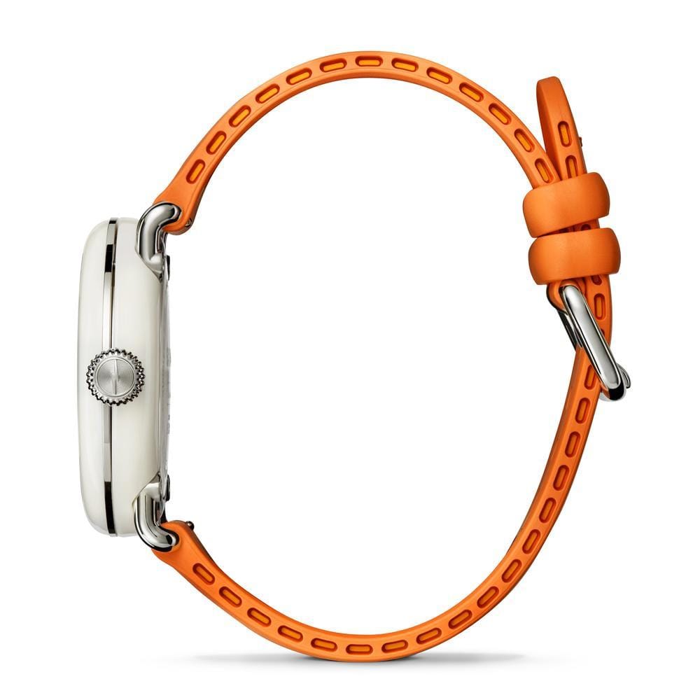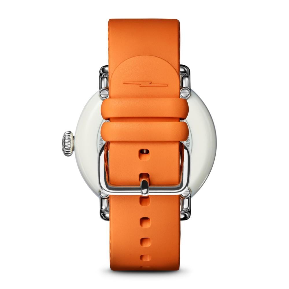 This Shinola Detrola is a vibrant, 41mm timepiece that blends Detroit-born craftsmanship with a playful, high-energy aesthetic. Built with a durable TR90 resin case and a stainless steel core, it features a striking teal blue dial protected by scratch-resistant sapphire crystal. Driven by a high-accuracy, hand-assembled Argonite quartz movement, the watch is finished with a flexible orange silicone strap and offers 5 ATM water resistance, making it a bold and reliable accessory for everyday casual wear