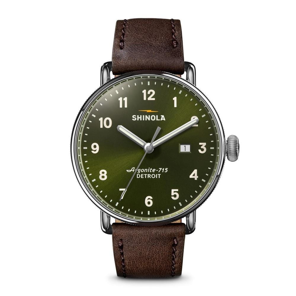 Guaranteed to strike up a conversation, the Canfield is an homage to all things clean and classic. Delight at the sunray finish of the dark green olive dial—such an open face is made possible by the top loaded case construction. Slim, diamond-cut hands and the calendar aperture are powered by the Detroit-assembled Argonite 715 movement. It’s all brought together by the classic stainless steel case and deep brown leather strap.