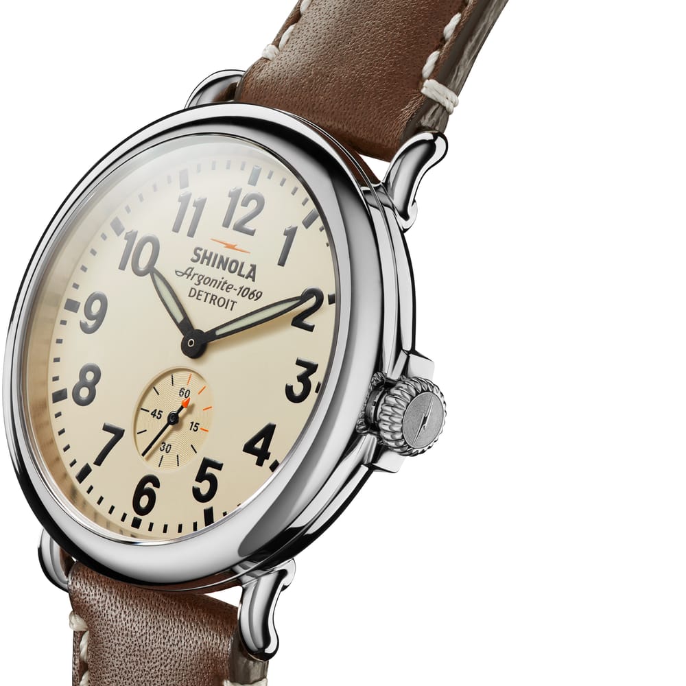 When stitch becomes statement. Built to last, and named accordingly, every detail of The Runwell was engineered with an obsessive focus to ensure the highest possible quality. The Argonite 1069 high-accuracy movement is the powerful motor behind this Cream dial and sub-second. The polished stainless steel case is accentuated by classic pumpkin crown while Dark Nut Brown leather straps complement the refined dial handsomely. A good watch not only tells time, it sets the tone for your whole day.