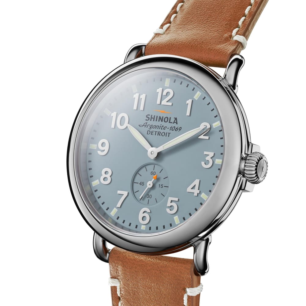 When stitch becomes statement. Built to last, and named accordingly, every detail of The Runwell was engineered with an obsessive focus to ensure the highest possible quality. The Argonite 1069 high-accuracy movement is the powerful motor behind this Blue dial and sub-second. The polished stainless steel case is accentuated by classic pumpkin crown while Dark Nut Brown leather straps complement the refined dial handsomely. A good watch not only tells time, it sets the tone for your whole day.