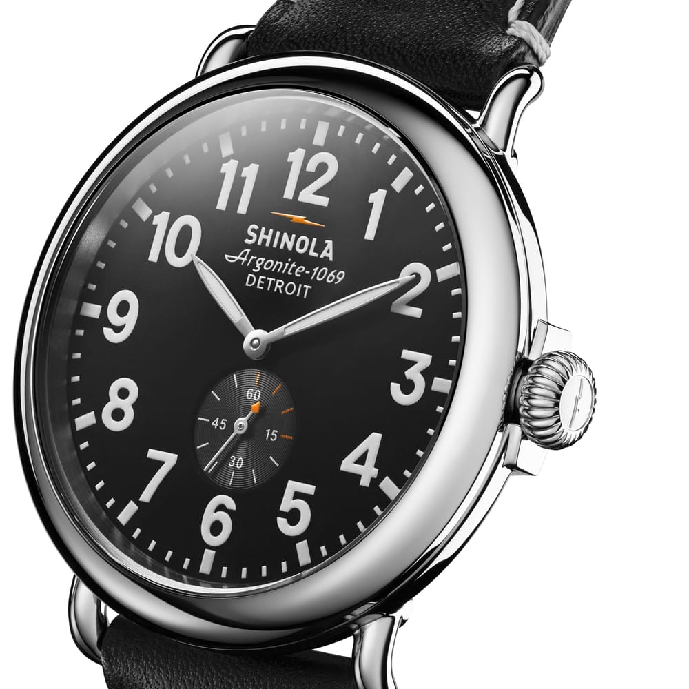 You can wear it away but out Built to last, named accordingly, this Runwell sports supremely classic color palette. Two hands and sub dial are driven by Shinola's Argonite 1069 high-accuracy quartz movement. Double-domed sapphire crystal protects the timepiece from scratches. With the stunning black dial, Super-Lumi Nova details, the shiny stainless steel, and the leather strap with striking contrast stitching, quality is this timepiece's most apparent characteristic.
