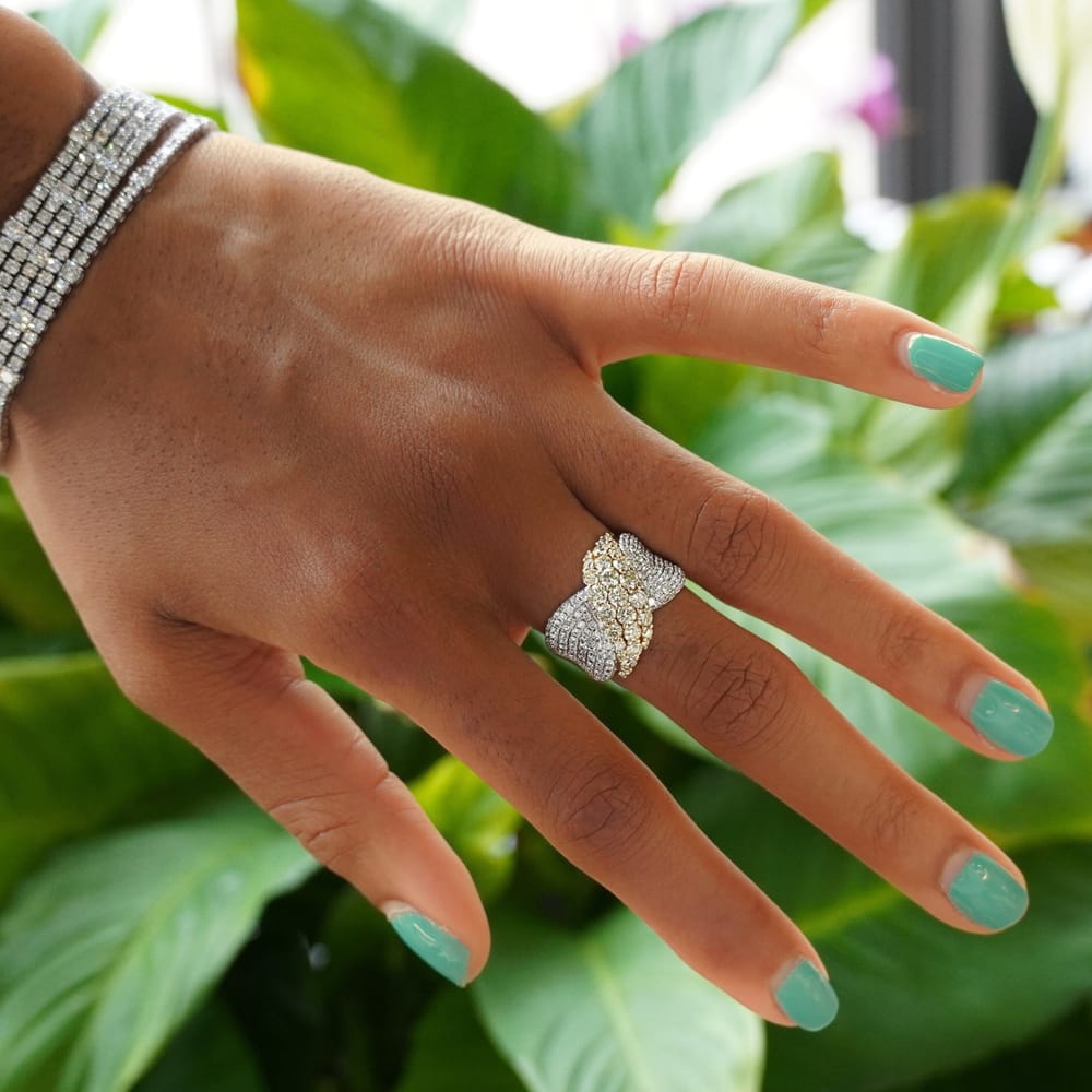 This exquisite ring features a harmonious blend of white and yellow diamonds set in a luxurious two-tone gold band, designed to elevate any outfit with its elegance.