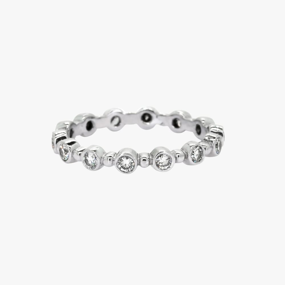 This exquisite bezel set diamond eternity band, crafted in 14K white gold, features 14 natural round diamonds, showcasing a total weight of 0.75 carats and offering timeless elegance for any occasion.