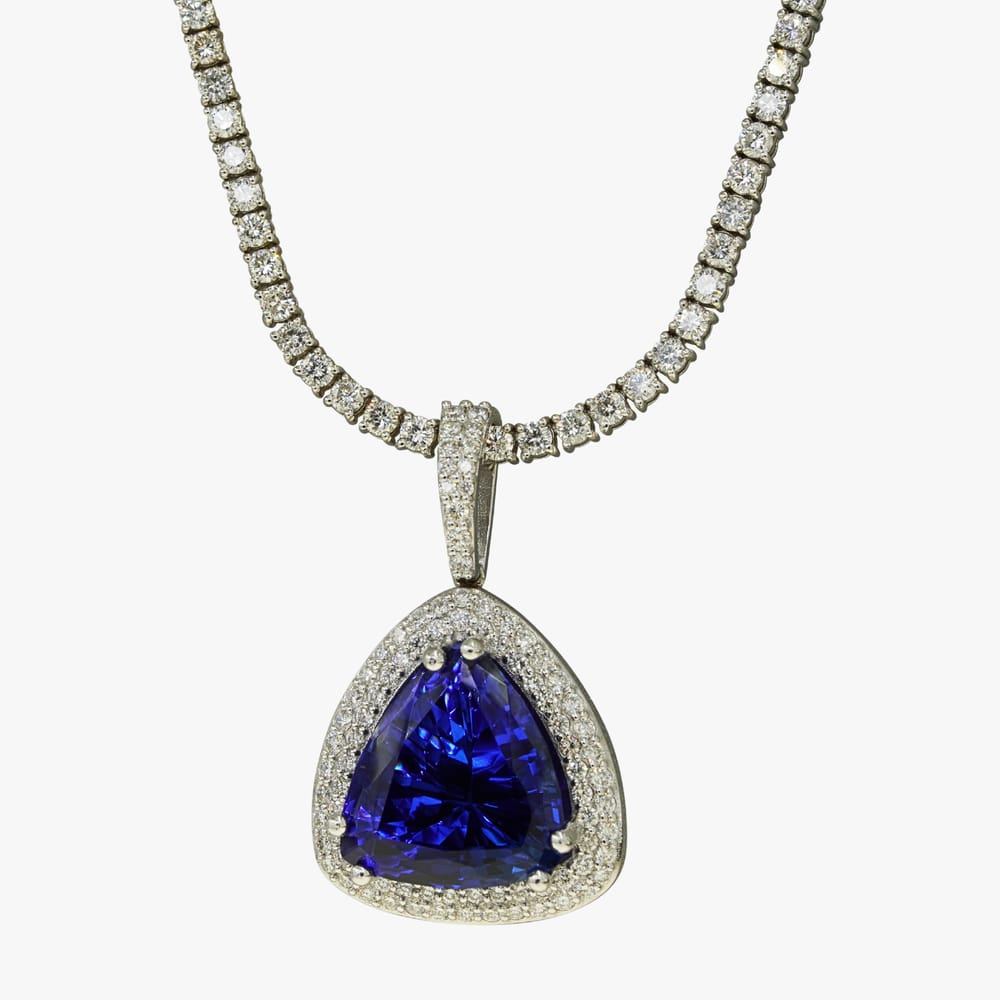 This exquisite pendant features a vibrant 22.00ct Tanzanite stone elegantly offset by 2.64ctw of sparkling diamonds, set in luxurious white gold, perfect for adding a touch of elegance to any outfit.