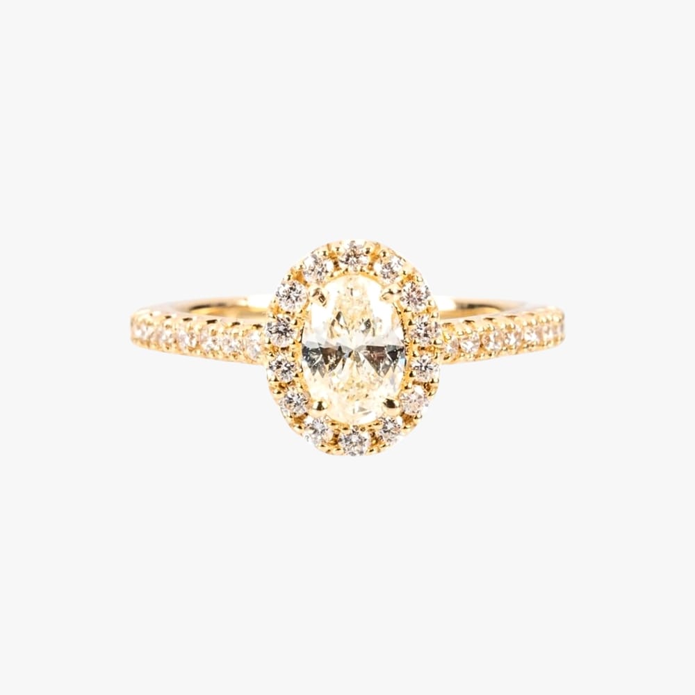 This exquisite engagement ring features a captivating oval shape, elegantly showcased in a prong set halo of dazzling diamonds, designed for the modern woman.
