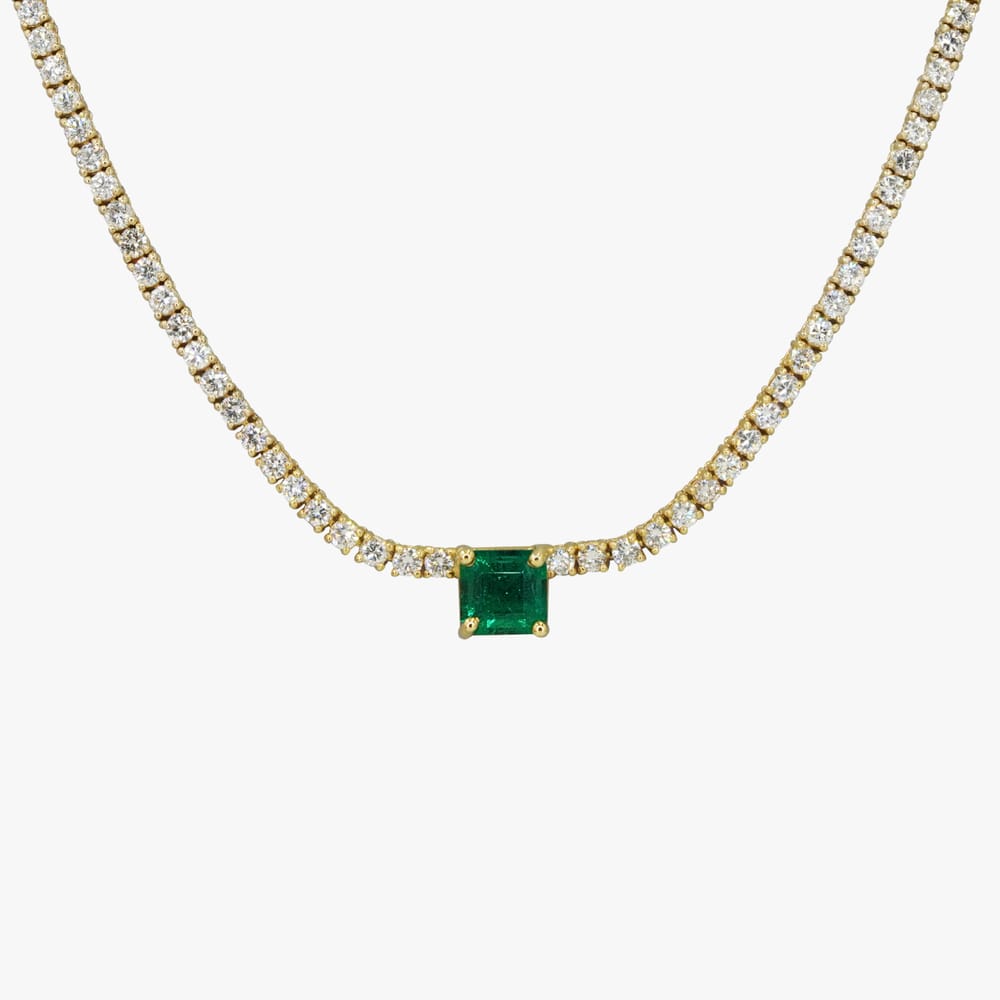 This exquisite tennis necklace features a harmonious blend of sparkling diamonds and a vibrant GIA green natural Beryl emerald, elegantly set in yellow gold, perfect for adding a touch of sophistication to any ensemble. Center emerald is natural , featuring excellent light return, brightness and hue.