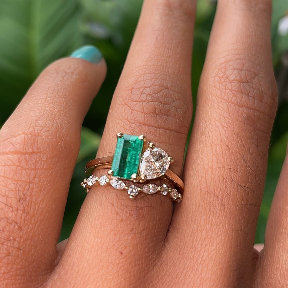 This exquisite ring features a vibrant emerald cut emerald adorned with a sparkling pear shape diamond, set in luxurious yellow gold, making it a perfect accessory for any occasion.