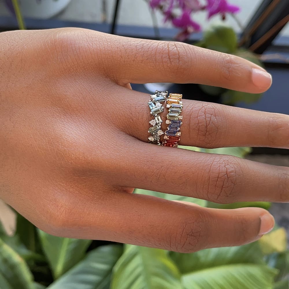 This exquisite ring features vibrant multi-color baguette sapphires elegantly complemented by sparkling round diamonds, all set in luxurious yellow gold.